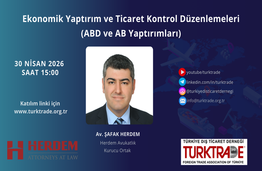 Herdem Avukatlık Bürosu Yönetici Partneri Sayın Şafak Herdem tarafından sunumu yapılan “Ekonomik Yaptırım ve Ticaret Kontrol Düzenlemeleri” konulu webinarımız 29 Nisan pazartesi 14.00-16.00 arasında üyelerimizin katılımıyla gerçekleşmiştir.